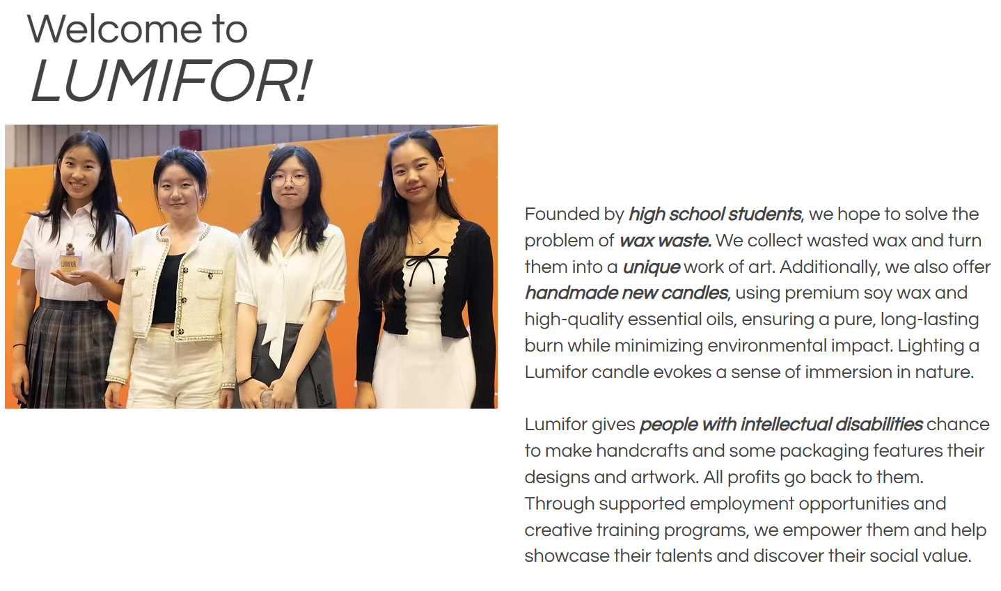 At Lumifor, we collaborate with individuals with disabilities to craft eco-friendly candles from recycled and soy wax, inspiring awareness for a more sustainable world.